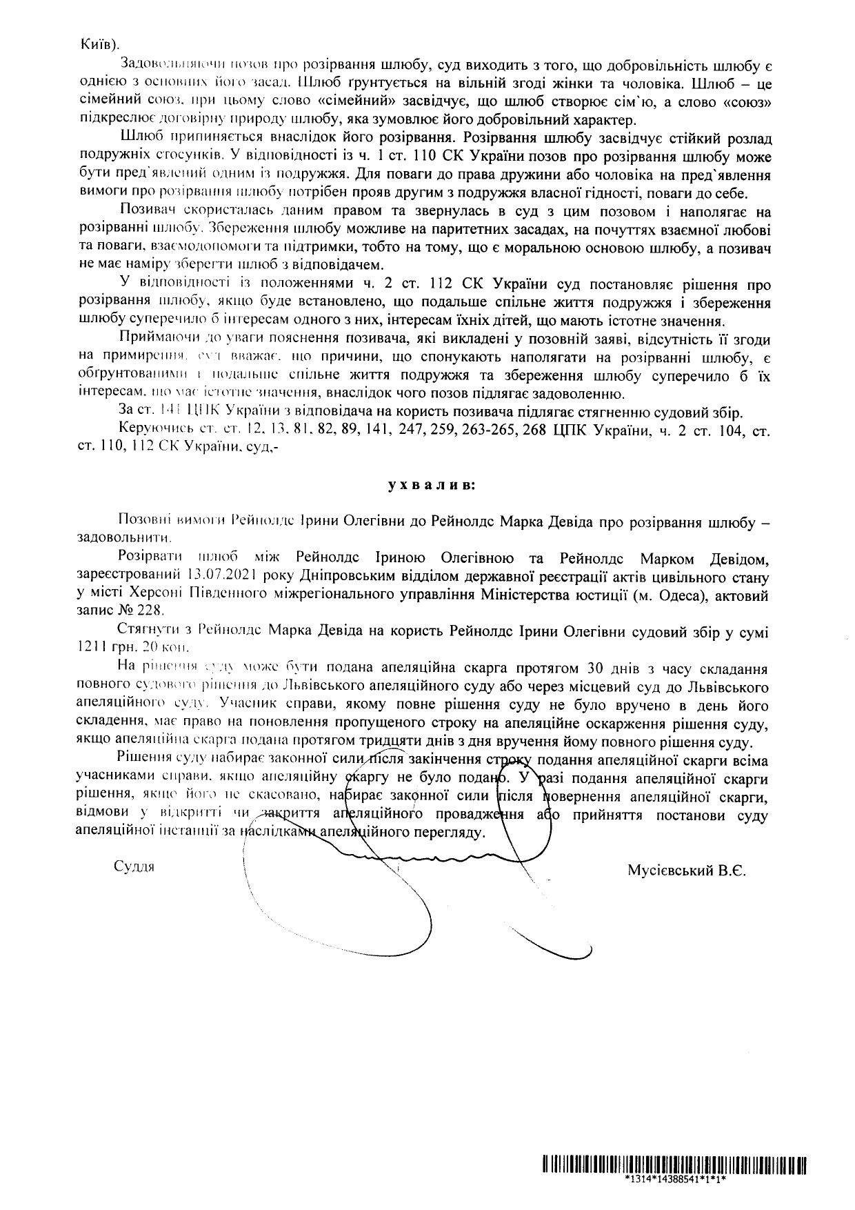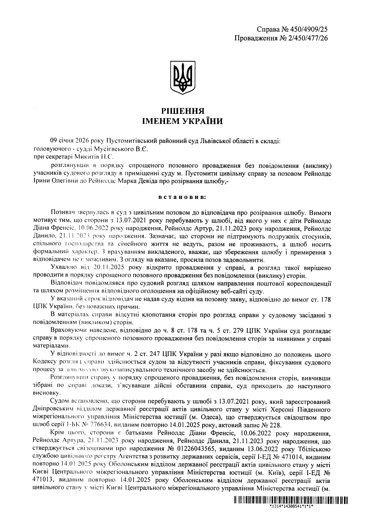 Оголошення (повідомлення) про ухвалення судового рішення по справі за позовом Рейнолдс І. О. до Рейнолдс М. Д. про розірвання шлюбу