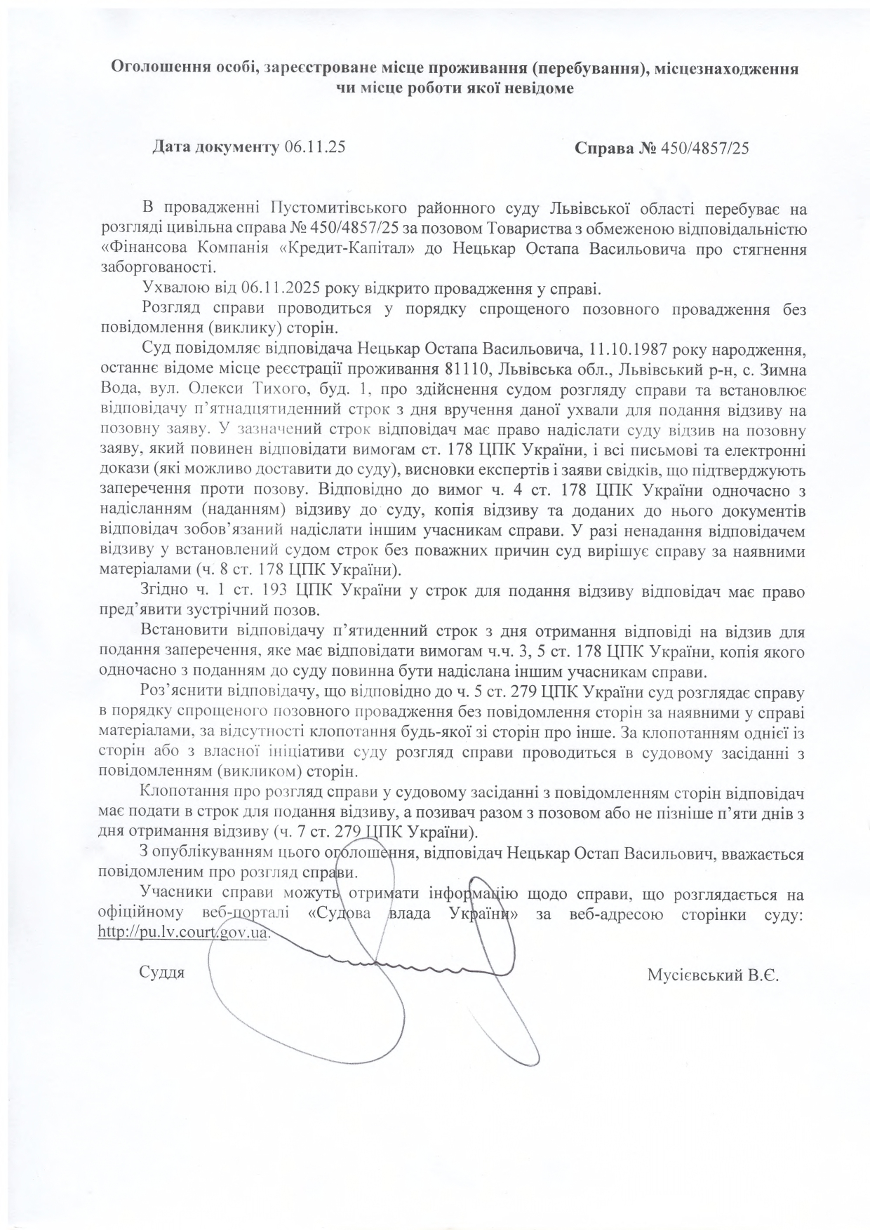 Оголошення про виклик відповідача - Нецькар Остапа Васильовича