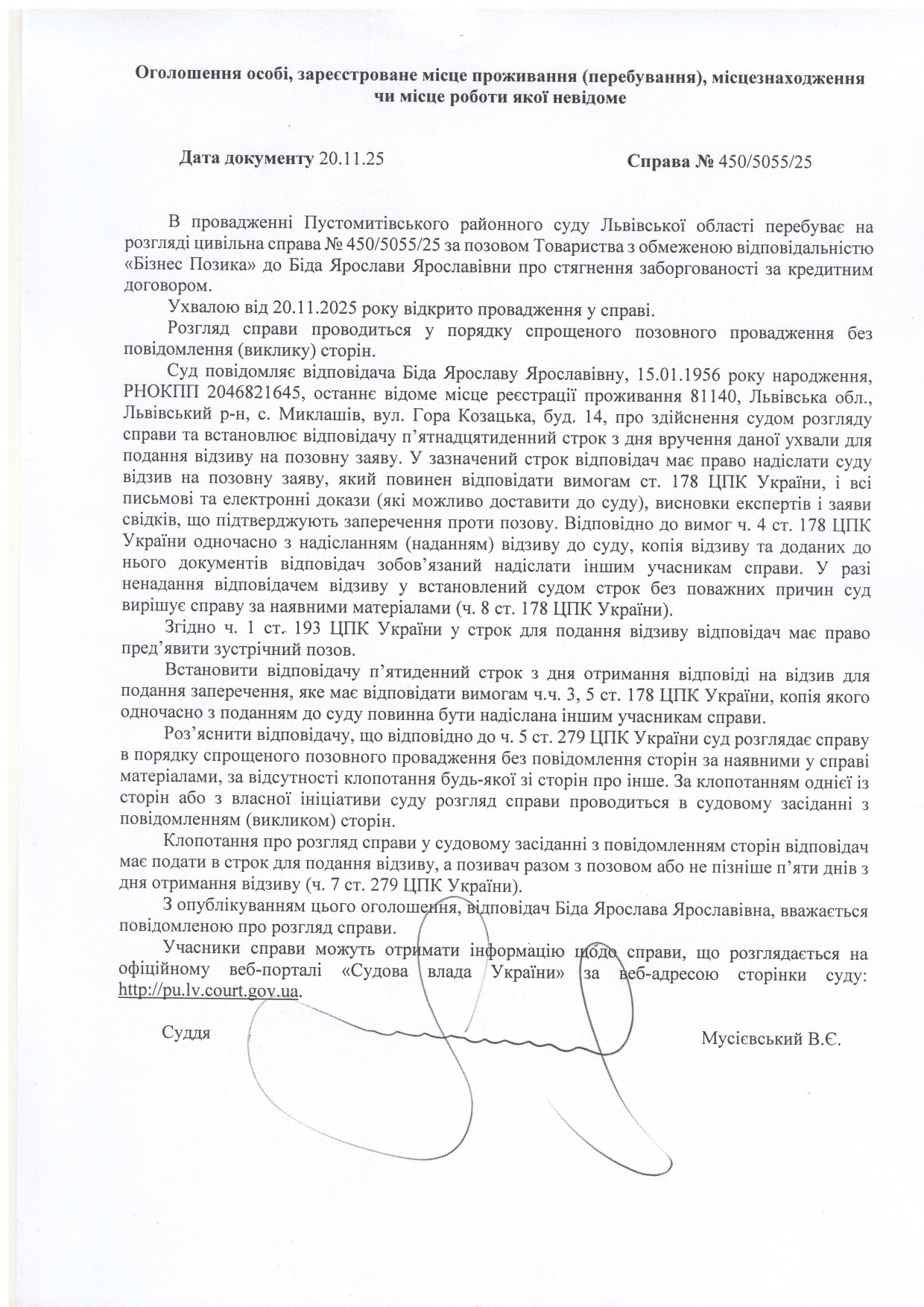 Оголошення про виклик відповідача - Біда Ярослави Ярославівни