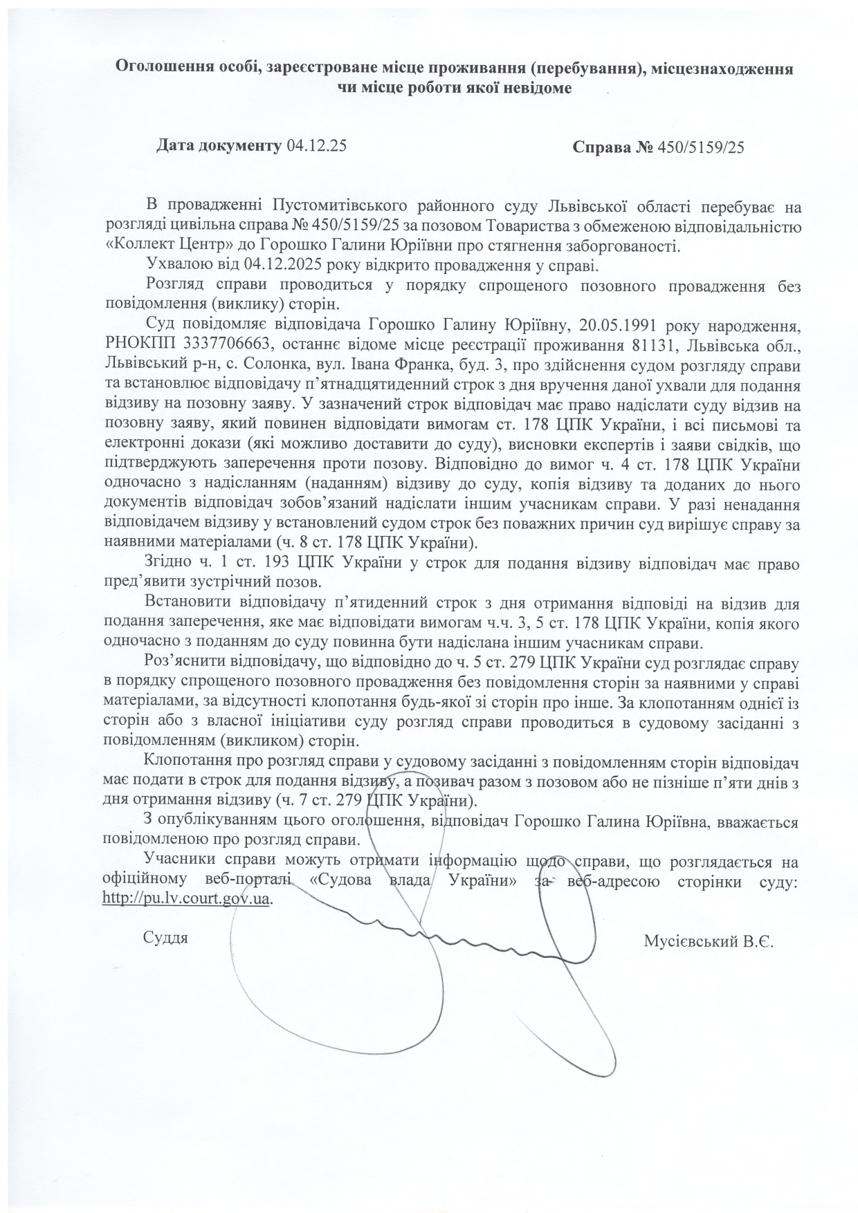 Оголошення про виклик відповідача - Горошко Галини Юріївни