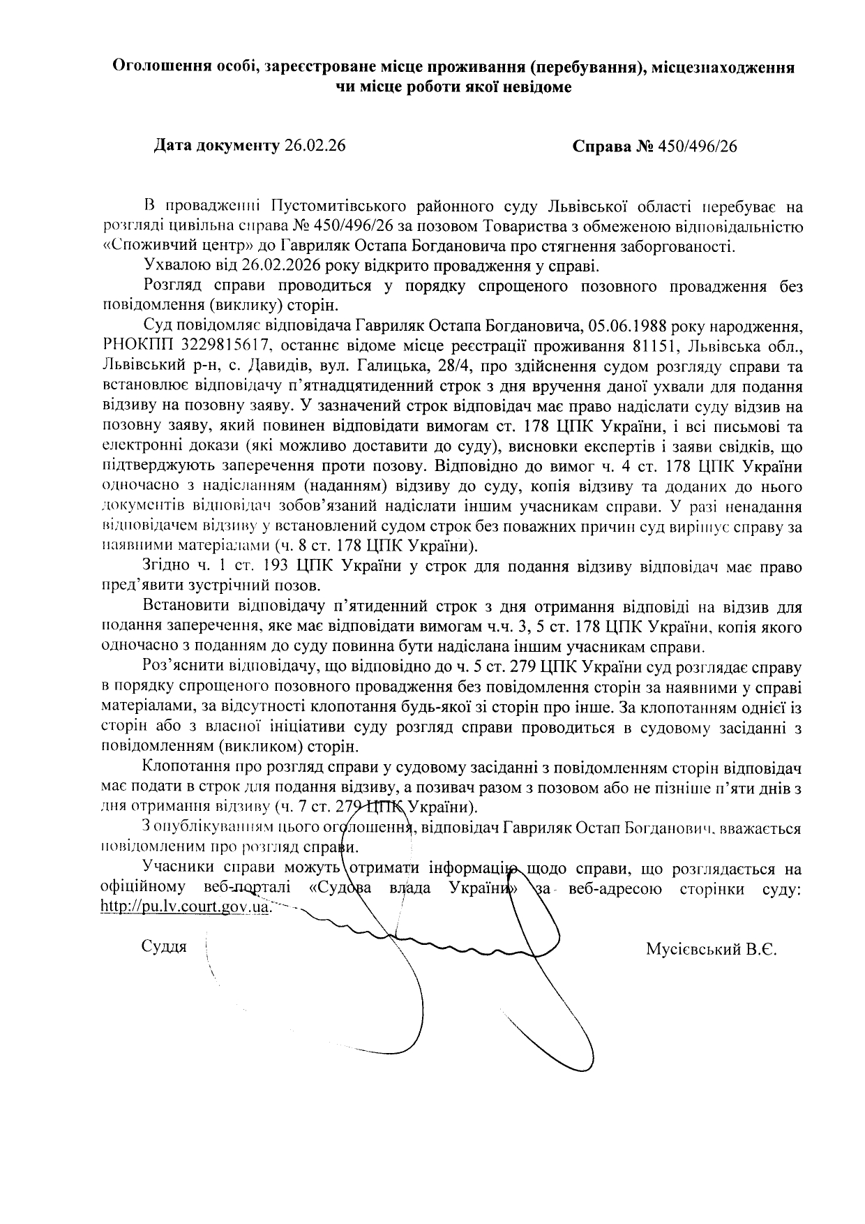 Оголошення про виклик відповідача - Гавриляк Остапа Богдановича