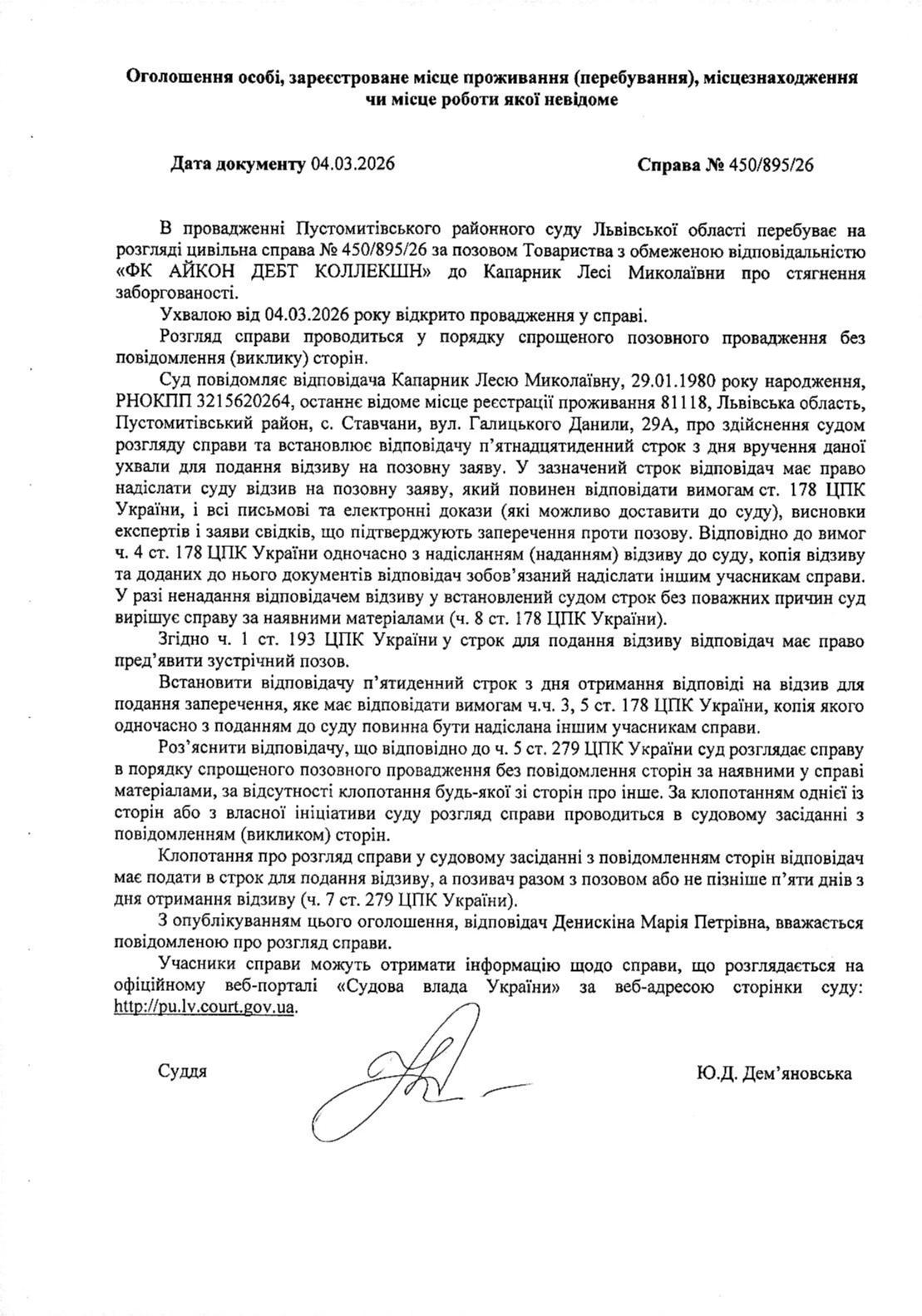 Оголошення про виклик відповідача - Капарник Лесі Миколаївни